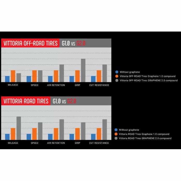Graphene 2.0 Compound: Vittoria’s unique Graphene compound is superior in rolling performance, grip, traction and longevity. This compound provides the performance benefits required for competitive, consistent racing output. The Original Graphene Compound raised the bar for performance evenly through all disciplines, whereas Graphene 2.0 pin-points the performance requirements from each cycling discipline and enhances them for speed, grip, durability and puncture resistance.